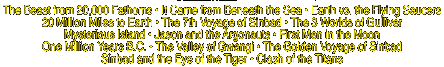 Ray's inspiration was evident! Muren went on to work on such films as Star Wars, Jurassic Park, Terminator 2: Judgement Day, The Abyss and E.T., the Extra-Terrestrial. It was reported in Cinefex magazine that some of the younger 'computer based' FX artists coming up had never even seen a Harryhausen film! One director sat his crew down and screened a couple of Harryhausen classics & the comments afterward were ho-hum. The boss's response was - "okay - I want to see you design the creature, make the armature, mold and paint the skin, make the tabletop sets, light the sets and match the rear projection plates, and then animate each frame by hand for 16 hours a day - all by yourself with no assistance - and we'll come back in about 5 days and see what your stuff looks like." |