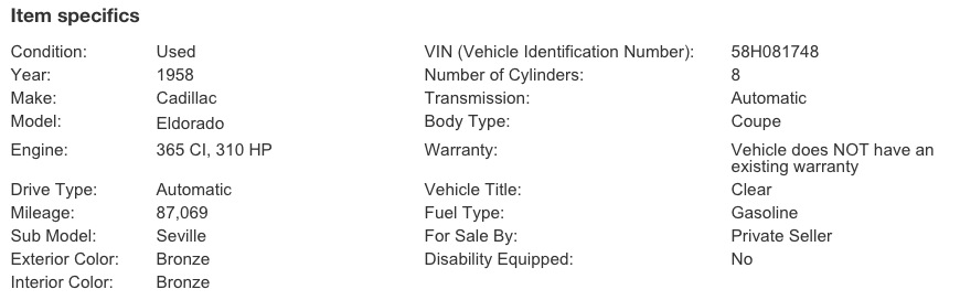 RARE, COMPLETELY ORIGINAL (not a restoration) with only one registered owner, this 1958 Cadillac Eldorado Seville is a knockout in its original Desert Bronze color and full leather interior. The Eldorado stood at the top of the Cadillac line. 1958 was the second and final year for the daring inboard 'shark' tail fins. Only 855 of the Seville Coupes were made, the same number as for its sister car, the Eldorado Biarritz convertible model…which commonly brings $200,000 and up. This stunning car came with a standard 4 barrel carburetor and leaf spring suspension with coil-over shocks. It does not have the trouble-plagued air-ride suspension which was dropped by Cadillac in 1959. Paint and interior are in amazing condition; no rust! This car has been garaged its entire life by the original owner and looks virtually as good as the day it rolled off the showroom floor. The photos tell the story, be sure to look at the enlarged versions. The Seville was equipped with every power accessory of the 1950s. This one has four brand new Coker whitewall tires and 15? Kelsey-Hayes turbine wheels, an electric eye self-dimming system for the new 1958 quad headlight setup, and the first all-transistor, signal-seeking car radio produced by GM’s Delco AM Radio (the only thing needing attention). Air Conditioning can be easily added. Wheelbase is 129.5?. Length is 223.5". 365 cubic inch engine displacement - 310 HP at 4800 rpm. The prices of these gorgeous statements of American automobile design are going up. Even the most rundown of these cars are being bought for full restoration. This car is flawless in design and visual appeal, and will turn heads wherever you take it. This is an extremely unusual opportunity to get a one-owner 'barn find' all original masterpiece. Car is located in Kansas City, MO and is in storage. Email your questions to rensewebmaster@gmail.com. Price $49,500. Vin # 58H081748 |