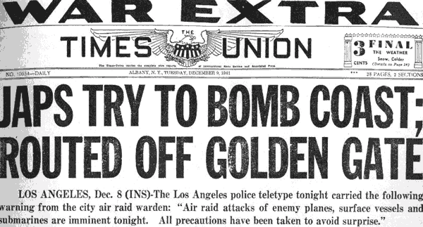 | Note- The following headlines preceded "The Battle of Los Angeles" and although the newspapers were quick to "name" the objects "Jap bombers" there was never any confirmation of what the "unidentified aircraft" were or where they came from, even though there were navy ships and planes sent to track them. JAPS TRY TO BOMB COAST - ROUTED OFF GOLDEN GATE Los Angeles, Dec. 8, 1941 (INS) - The Los Angeles police teletype carried the following warning from the city air raid warden: "Air raid attacks of enemy planes, surface vessels and submarines are imminent tonight. All precautions have been taken to avoid surprise." SAN FRANCISCO, Dec. 8, 1941 (INS) - The attempted attack on the San Francisco Bay Area tonight by enemy planes was a large scale operation, Brig. Gen. William Ord Ryan, head of the Fourth Interceptor command, said late tonight An apparent attempt by Japanese war planes to bomb the San Francisco Bay Area was reported last night (Monday) by Brigadier General William Ord Ryan of the Fourth Interceptor Command, who said a large number of unidentified aircraft were turned back at the Golden Gate. He said the invading planes vanished to the southwest over the sea, after search lights at the Presidio of San Francisco were turned on and other measures taken to thwart an attack. Ryan did not disclose the nature of these measures. The general's statement came after three hours of uncertainty in which San Francisco was partially blacked out in two raid alarms. It was the city's first attempt to black out for air raid protection. Sirens wailed continuously, air raid wardens rushed from door to door darkening lights in their areas, and in the downtown area there were numerous crashes as automobiles piled against each other. Police said a woman was shot and wounded by a California State Guardsmen near the Bay Bridge. The reported repulse of planes was not explained in great detail by General Ryan, who said no night fighting planes were sent aloft. |