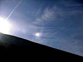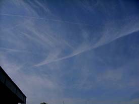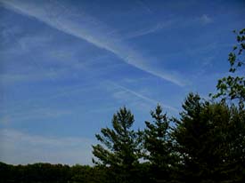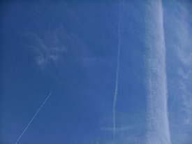 stretch of sky, leaving contrails that slowly spread out to form high,