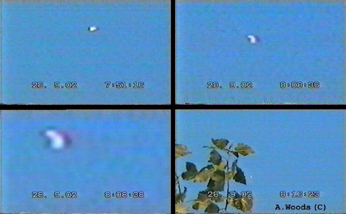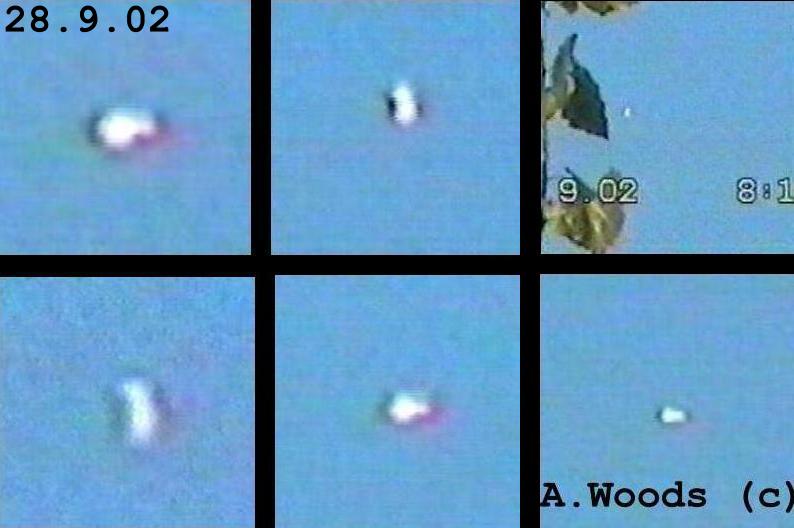 | But it wasn't until the end of September 2002 that I would go on and witnessed and film probably my best sighting since the fantastic sightings I managed to film back in March. It happened early in the morning of the 28th September, it happened just like so many other sightings before where I had just opened the door to my back garden and there they were, directly above my home. I noticed this large object sitting motionless in the sky, the object looked quite high up but still it looked big to the eye -- at a guess as big as a commercial jet. After staring at the object briefly for a few seconds with amazement I quickly ran back indoors and grabbed hold of my camcorder and tripod because I new I had plenty of time to get it on the tripod because this object was going nowhere in a hurry. Over the next half an hour I filmed some excellent footage of this object, most of it on a tripod and with good reference points. On playback of the footage you could clearly make out that this object was rotating continuously and shaped very odd like a cashew; it was really bizarre. |