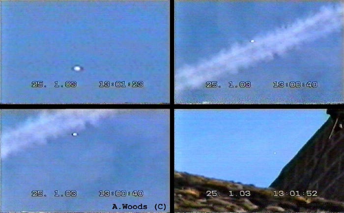 | In the next following few months coming to the end of 2002 I filmed several interesting sightings but it wasn't until January 2003 that I filmed a quite significant UFO in more ways than one. It happened on the afternoon of the 25th January & was witnessed by members of ufo magazine (uk) who happened to be visiting me. This object was witnessed by 4 independent observers and filmed on three separate camcorders. |