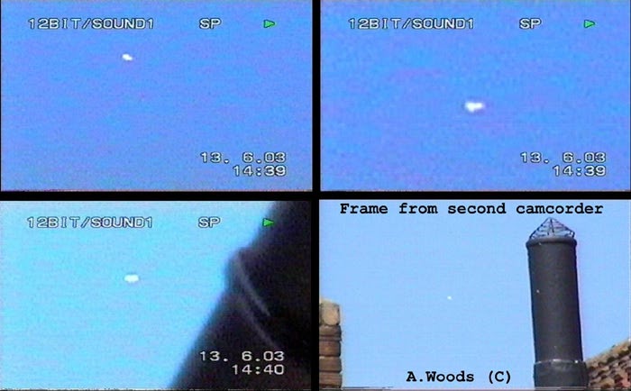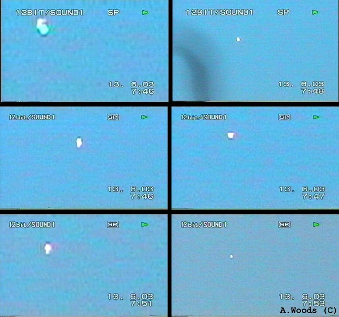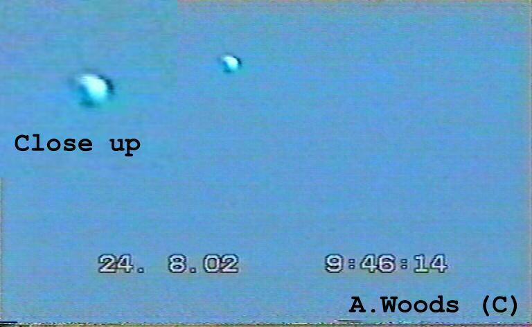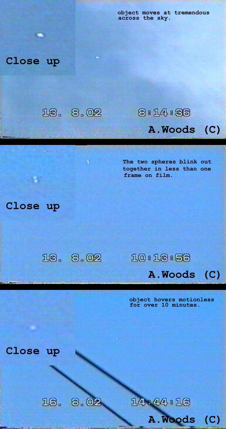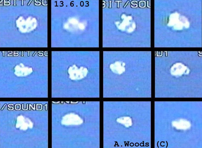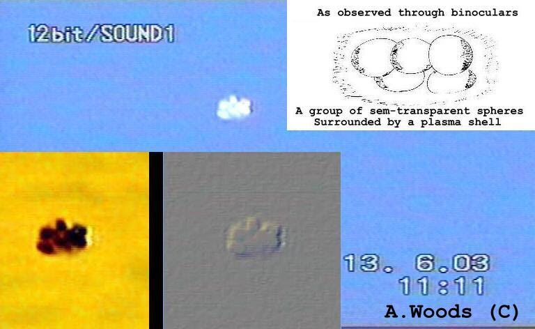 | Friday the 13th June may seem unlucky for some but on this day I would go on to witness my best sightings so far of 2003. It all started early in the morning, once again I had just opened the door to my back garden when I noticed an object sitting stationary in the sky to the left of my position, I quickly rushed indoors to get my camcorder when I got back the object hadn't moved at all. I started to film this very bright & strange UFO for around 20 minutes. This craft appeared to morph & expand itself continuously, it was really bizarre to witness. Eventually it moved off very slowly and out of my view. After all the excitement of witnessing this sighting I had a strong premonition more was to come on that day. I rang my brother-in-law up "Tony" and told him he had to get to my house as quickly as he could, within the next couple of hours my best sighting of the day would happen. It was around 11am when to the west of our position high in the sky we noticed what we thought was a single stationary object. My brother-in-law located the object through his binoculars whilst I was trying to locate it through my camcorder. It started to move forward very slowly heading south east, directly above our position. At this point I decided to stop filming for a second and get my tripod. As I was fumbling trying to attach my camcorder to the tripod the object suddenly and dramatically dropped in altitude, it was really breathtaking to see this. Suddenly we could make out real detail of the UFO. In my panic I decided to abandon the tripod and just get my camcorder on the object as quickly as I could, at this point my brother-in-law could make out fantastic detail on the craft, he said he could make out that the craft was in fact a group of luminous but semi-transparent spheres encased in what looked like a plasma shell keeping them together. We also noticed there were several detached spheres shooting around this large plasma sphere object. |