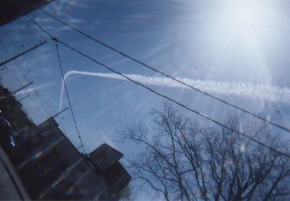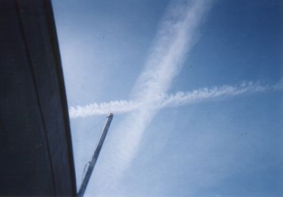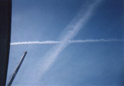 Here are some chemtrail pics -- taken at our office door -- the curved one is the same smaller chemtrail that formed the usual large X.