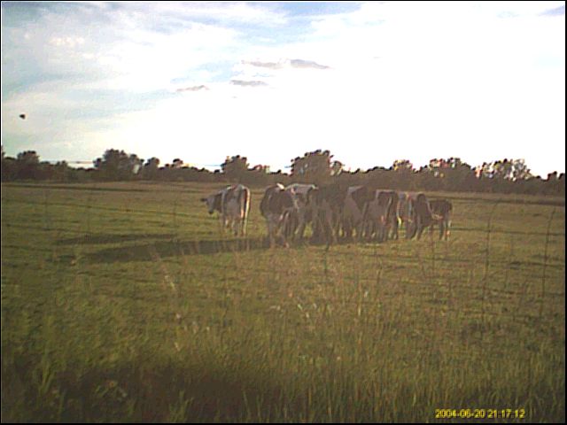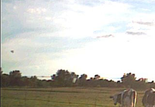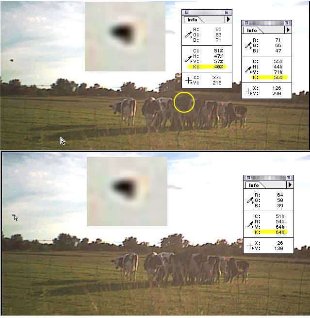 | Quite often the blur factor of both distant-large and close-small objects can be similar, fooling the eye. The first thing to note in this photo is the extreme amount of light from the right as the sun rises. This light is so bright and pervasive that it even diminshes the dark patches on the cows. Using a Photoshop tool that gives percentages of color as well as black intensity, we can take samples from various places in the image and see that the "wedge" object maintains the black intensity level (K) of foreground material, which would not happen if it were a distant-large object in the sky. In the sampling below, the edge object is turning up actually darker than the spots on the cows as well as the foreground shadows they produce, which tells us the wedge is also something close to the camera. |