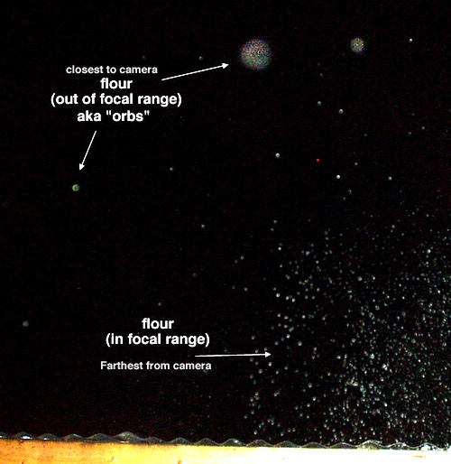 All specks of flour falling outside the BLURFO zone, where the camera could