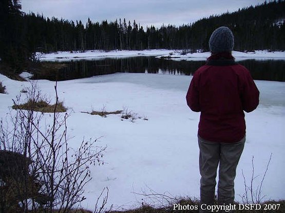 HBCC UFO Research Note: This report is a re-post, more detail the witness provided along with a number of pictures she took of the area where the sighting took place. Pond area. Also I would like to point out that Jen will be joining me this Sunday night, May 6, 2007 on the Vike Report radio show I host. So be sure to tune in, very interesting story. I decided to re-write this story to include more details and to correct the mistake I made in my estimated distances. I was out yesterday at the pond with someone and got a better estimation of distance. This experience took place in late May, 1999 in a logged out valley 5 minutes outside the small city of Corner Brook, Newfoundland. I was out for a solo hike in the mid afternoon of a warm, overcast (no fog) calm day. I have been living in Newfoundland since 1994 and have spent a great deal of time walking/ skiing/camping/biking in this particular valley and have never had any experiences similar to this one. Before I describe what I saw I will state that I am rational, lucid individual with no history of hallucinations. I work in the health care field and have, I would say, a strong foundation in critical thinking skills. I have no opinion of what it was that I saw. All I can do is describe my experience and try to convey a degree of the shock and disbelief that I experienced before and after the event. After hiking for about an hour I reached the top of one of the low mountains at the edge of the cut line and was about to enter the woods when I felt this strong sense of uneasiness. The fear seemed unwarranted so I kept going and I was again struck by an even stronger sense of discomfort so I turned around and took a short cut back out. I scrambled down the face of the low mountain and across a large bog and hiked out the majority of the path. When I was about 5 minutes from the car I decided to turn up a different path which led to a pond about 2 minutes up a small dirt track.
