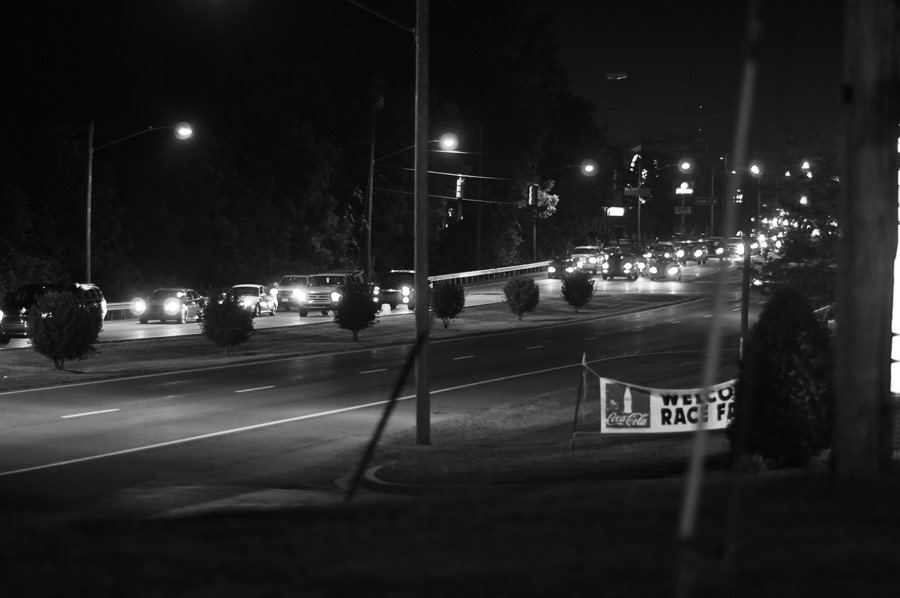 The anomalous object in the sky seen in this photograph moving above a stream of racing fans headed to the track may be an elusive 'black triangle.' The Photographer isn't certain, as it was not perceptible at the time the photo was taken, but analysis of the image shows no signs of tampering and any other explanation escapes us. It does not appear to be any form of lens flare from the bright cars or street lights, and the shot was taken from outside, not behind glass (such as from inside a vehicle or a building where reflection on glass might account for the object). "The antenna you see in the foreground is a telephone guy wire. I was standing on a hill over looking traffic. The camera used is a Nikon d90 with a 85mm f1.8 Nikon lens. I often shoot in b/w at night to avoid orange and bluish tint that one gets when dealing with mercury vapor, sodium and incandescent lights.Digital cameras sometimes have a hard time dealing with color temperatures especially with mixed light sources. The date the photo was taken was on Thursday, August 23, 2012 at 8:56 pm. The location was around the 1100 block on Volunteer Parkway Bristol, Tennessee about 5 miles North from Bristol motor speedway." - Rick |