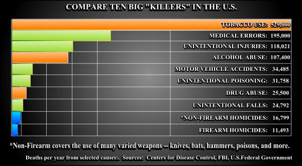 This is January 6, 2013. The entire population of the United States is the clear target. The traitors are those who will succeed, if they are not stopped, before the entire nation can be DISARMED. “Another controversial position taken by President Obama is the expansion of federal authority beyond Afghanistan in the war against terrorism. In a secret interagency memorandum issued by the administration's legal counsel in 2010, wherever someone who is a threat to the security of the United States is located, even outside of war zones such as Afghanistan, it is lawful to kill him "if it is not feasible to take him alive." This expanded geographic jurisdiction was demonstrated in the case of Anwar al-Awlaki, an alleged leader of al Qaeda who was killed in 2011 by an American drone in Yemen with secret consent from the Yemeni president. Thus the war is not simply restricted to terrorist activities in Afghanistan anymore; it can be anywhere. The case was also unprecedented in that it marked the federal government's targeted killing of a U.S. citizen without a trial. It would be difficult to find a more insightful source into the Obama administration concerning these legal issues than Attorney General Eric Holder. In a speech to students at Northwestern University School of Law this past March, he reveals the administration's position as one whose actions "must always be grounded on the bedrock of the Constitution and must always be consistent with statutes, court precedent, the rule of law and our founding ideals." After praising the Executive Branch's fairness in allowing terrorists to be prosecuted in civilian courts, he goes on to explain the necessity of occasionally bypassing those courts in favor of military tribunals: "Military commissions are also appropriate in proper circumstances, and we can use them as well to convict terrorists and disrupt their plots. […] Reformed commissions allow for the protection of sensitive sources and methods of intelligence gathering, and for the safety and security of participants. […] A key difference is that, in military commissions, evidentiary rules reflect the realities of the battlefield and of conducting investigations in a war zone. For example, statements may be admissible even in the absence of Miranda warnings, because we cannot expect military personnel to administer warnings to an enemy captured in battle. But instead, a military judge must make other findings for instance, that the statement is reliable and that it was made voluntarily." The Military Commissions Act of 2009 redefined who would be eligible for trial before military commissions, stating that an "unprivileged enemy belligerent" is compared to the previous "unlawful enemy combatant."” (2) This evil-dance of deceptively criminal-non-choices is still being used to try and terminate what’s left of the nation. This has taken the form of a massively-botched series of crimes that have been going on officially since the school shootings in Columbine. They’ve been progressing of late, from the botched lone-gunman theory in Aurora, Colorado up to the determinedly-clouded Murders in Sandy Hook Connecticut on 12-14-12. The goal has been to force the public to REACT to the murder of twenty school-children; by liquidating the Second Amendment in order to end the deaths of anyone that will or might be killed by gun-violence, anywhere in the USA. They’ve created a problem that they want us to buy their solution to. But of course, the whole insanity in Sandy Hook is to DISARM THE AMERICAN PUBLIC. Look carefully at the details which this graph clearly shows. There were 1,094,248 deaths that comprised the top ten “BIGGEST KILLERS” in America last year. Of this number 11,493 were caused by Firearm related Homicides. This means that approximately 95% of all the deaths that occurred in this country were NOT RELATED to Firearm Homicides. Why then this push to ignore the huge number 529,000 supposedly DIED from tobacco use, while we CRIMINALIZE THE SMALLEST NUMBER OF DEATHS RECORED, among the top ten killers of human beings in order to DISARM THE PUBLIC.