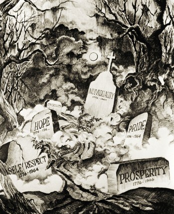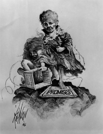 Ask yourself which is more important the 3 million now, in the shadows of on-going wars in both the Middle-East and Europe, or 330 Million that are the entire population of the United States? The simple answer is that the US has always been the real target: All the rest of these continuing war-crimes have just been target practice. The damning part of what The State of the Nation 1966 was intended to do was to awaken; people around the world to the truth behind all of what was being done in The Great Society, The War on Poverty and The Age of Contradictions. It would have been the first major attack on government polices across the board, during the Vietnam War, and before any massive rejection of this government’s polices had yet been launched. I put myself in the crosshairs with that project when it was publicly displayed to just over 5,000 people in Oklahoma City. What followed was 14 months of being shot at, weekly, followed, wire tapped, chased and constantly threatened; but which actually ended when LBJ decided to stop his bid for re-election. The FBI and company were on this and the city police collaborated with them at ever step of the way. My gallery was closed, my business was reduced to nothing but I had help from some very creative people, otherwise we would not be having this conversation now. In the middle of this I sought help and managed to arrange for an apprenticeship with the then living tenth generation Van Dyke, in Rio. That was canceled by massive riots in Rio, which prevented me from going. Then I got help from two people that I had known since highschool who had retired from NSIA. They made certain that I was able to keep breathing. But the damning nature of the images lives on: To date the surviving images still point directly at what went wrong with this place that had once been a nation but of course for those who came afterward, these images hold little if any real content today.