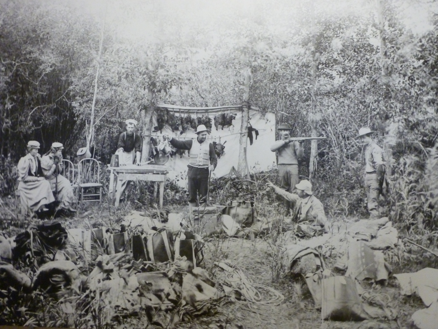 (Hunting party in the 1880s in Wyoming near Dubois. They shot turkeys, rabbits, antelope, buffalo and bear. They sliced them up, cleaned them, gutted them and ate them. Today, we non-chalantly walk into a grocery store for our packages of fresh chicken and steak with no blood or any of the messy stuff of killing food for ourselves.)