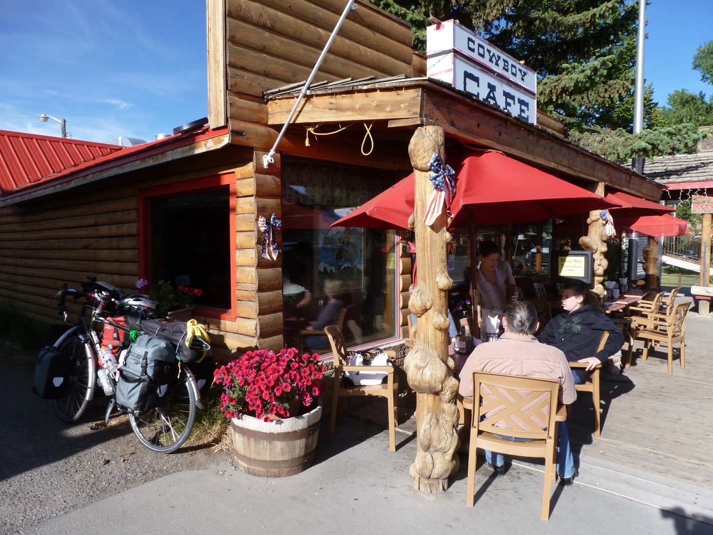 Two lean dudes, sporting jingling-spurs with sweaty Stetsons on their heads—walked into the Cowboy Café the next morning in Dubois, Wyoming. They stank of cigarette smoke and horseshit fresh from the rodeo arena. They took one look at us with our bicycle cartoon jerseys tight against our bodies and specifically my black runner’s tights and muttered something that I can’t really repeat on paper.
