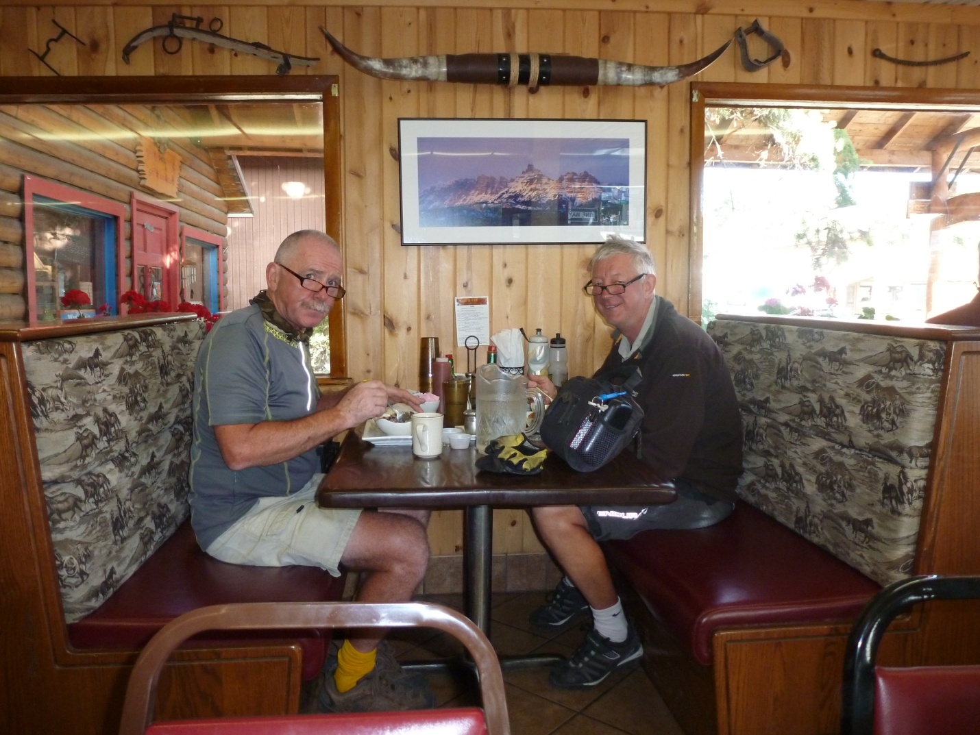 (Gerry and Dave eating breakfast at the Cowboy Café. City folks prefer granola and yogurt. Cowboys demand bacon, eggs, hashbrowns, black coffee, toast and jam. They add a little pinch of Skoals between their cheek and gums as they walk out.)