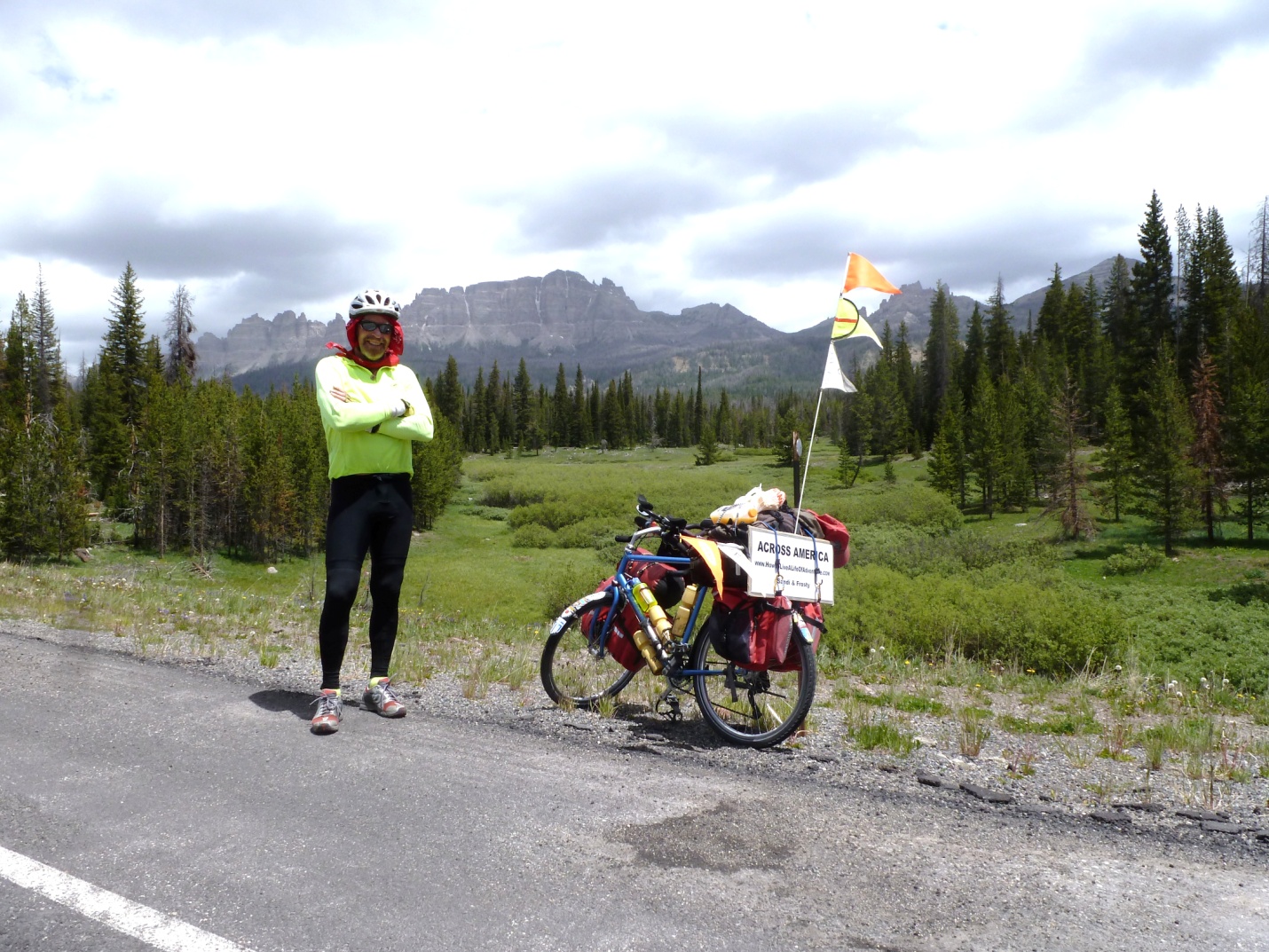I began the long climb into the Bridger-Teton National Forest up to the top of Towogatee Pass at 9,545 feet. Ahead of me, a dramatic climb at six percent that seemed to reach into the clouds. Hellacious gray rock summits faced me on the skyline. When I see such a climb, I put my head down and drop Condor into granny gear at 24 front chain ring to 34 rear freewheel.