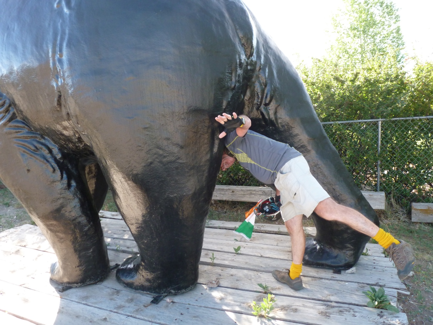 After we paid our bill, we pedaled over to the “Biggest Jackalope in Wyoming” and took a few pictures. As you might know, a Jackalope represents a mythical creature, the result of a cross between a jack rabbit and an antelope. They hop and run at blazing speeds. They spit, growl and dash around devouring women and children. At the display, they threw a saddle on one of those eight foot furry monsters and invited us to ride one. Amazing that we got away with our lives!