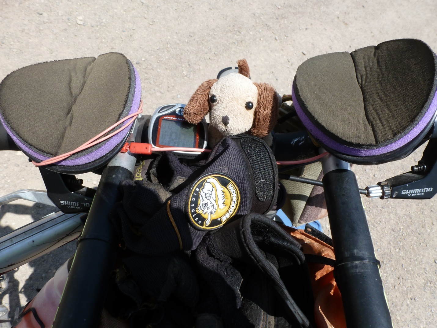 (Every cyclist decorates his or her bike to individual tastes. For me, I sport decals on my fenders from countries around the world. This cyclist features a little toy dog.)
