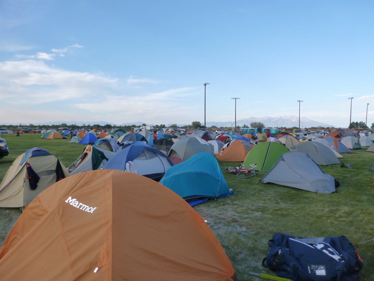 (Ride the Rockies with a sea of tents stretching across a parade ground in Alamosa.)