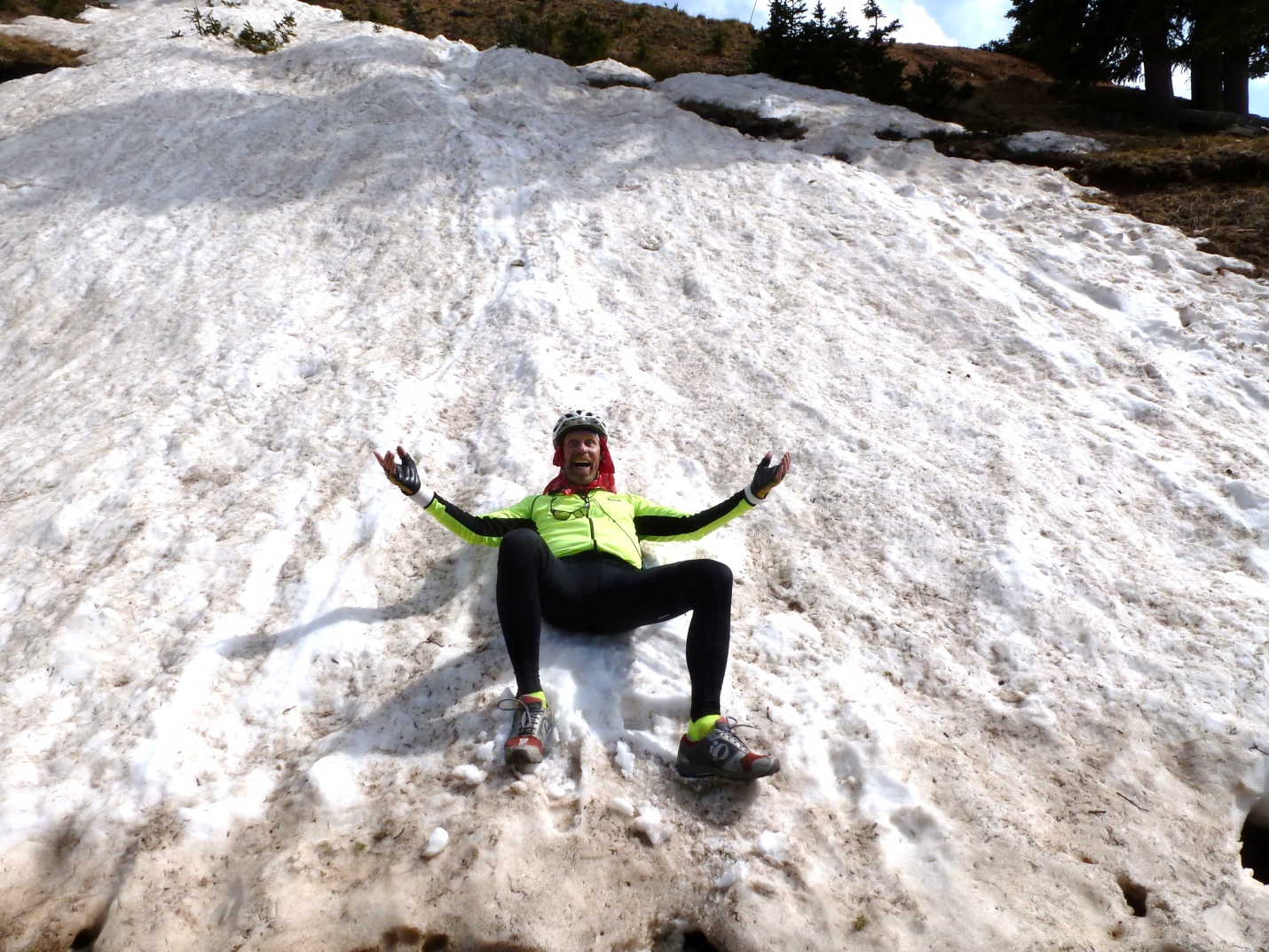 (Jumping into a snow bank to cool off from the five hour climb up to Berthoud Pass.)