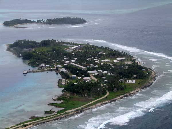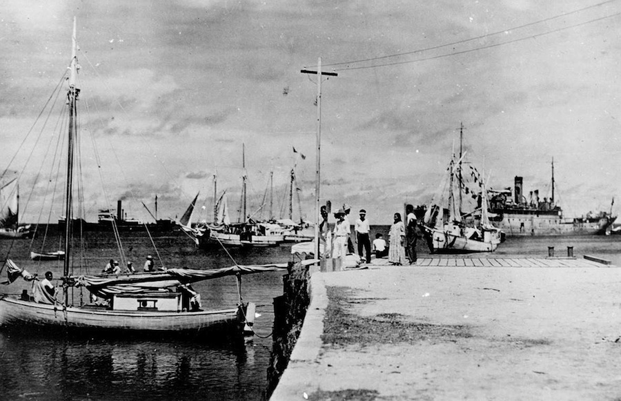 showing the dock on Jaluit Atoll, Noonan holding his stick with the sign at