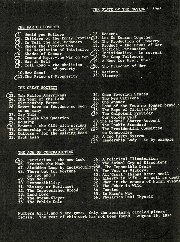 After I finished the State of the Nation 1966, which the illustration and the index above were part of: I inadvertently became a private detective, working as a reporter on my own magazine. My then partner, who had been my bodyguard during the two years of government harassment over this project, was the headliner. My partner and a friend of his kept me alive; during the time when LBJ was wrestling with his presidency and with ending the Vietnam War while I was graphically attacking both him and his presidency. (1) In the afterglow of politics I became absorbed in a case, in Oklahoma, that was very much like the Karen Silkwood case which came later. After LBJ decided to quit running in 1968 I left the state for California. A few months later my partner who remained in Oklahoma was murdered by a pair of hired kids paid off by Kerr-McGee Oil. His “life” cost the criminals just $100 bucks, fifty for each teenager. He was a retired NSIA Agent, the kind of man the government then spent millions training: They worked in teams of five or six to overthrow nations when he was active. He was brilliant. I thought he was immune to death, because he was so adept with so many weapons, self-defense and all the martial arts. Despite all that he was murdered on a beautiful Sunday-Afternoon, at home, while watching a football game, by two kids that came to his door ‘asking to use the phone” for their stalled jalopy and then they shot him, twice. I found out about his death long after it happened. I was in California at the time. I had to let it go because I couldn’t change anything. I could only get myself killed. I went back to drawing and painting but some of what I did before has lingered for times like this. Since the formal announcement of this Mother-of-All False-Flag events, on October seventeenth: I’ve been looking for ways to explain, if possible, the context of this final chapter in the Murder of the United States of America. A couple of completely obvious things stand out. The public may continue to scoff, but that does not make what I’m about to say any less possible, or true. The first thing this country must do, is that we must ‘Outlaw” both political parties, because in reality they are both part of the same side, and always have been at least since the 1960’s. In my slightly skewed career I’ve worked for two governor’s two different AG’s in two different states, the California Chamber of Commerce and a number of national and international people and organizations—on both sides of the aisle, which never bother to actually segregate the players. That part of this is only for the public. It’s like a luxurious hotel in which the various and supposedly contentious “parties” come to meet and eat and play. Just as opposing councils in a courtroom will appear to tear each other apart in-testimony and acrimonious-outrage—but the minute the court-session ends they go out for drinks and more as tight as ‘family’ members: Just waiting for the next time when they might be on the “reverse side” in another issue in which each of them gets hired. Yes! It’s a game: But it’s a deadly game in which millions, sometimes billions can easily change hands. Sometimes “the players” screw up. Some are killed in the process, but most often it’s about improving personal and corporate-power, assuring and increasing credentials and most of all it’s about not rocking the one-and-only-boat that everyone loves & lives in! Whenever you hear anyone talking “Bi- Partisanship” RUN! This nation was built on the idea that there should be many different points of view on every topic. Politicians have force-fed the public the idea that somehow the parties actually ‘stand for things’. That’s pure crap. Every four years each party makes up a national-platform. All that is, is a pile of words collected in a heap: To be used or tossed as needed in a continuing game of political SCRABBLE. None of that stuff means anything at all. The proof lies in the fact that the supposedly sacred political-platforms can be changed at the drop of a coin—and frequently are! And no one gives a damn about the public until the election-season starts… The term NON-PARTISAN should be offensive to anyone that cares what this government does. Anywhere or anytime this terminology is gloatingly brought up: This happens only because it means that they have all agreed wholeheartedly! From this, the public should understand that there is only one point of view (That’s ALWAYS true even if you can’t see it: No public arguments are allowed! The public sees and hears this stuff each and every week, yet the herd fails to understand the political-sign-language which is being spoken openly and proudly as if this were a really GREAT thing! Obama refused to wear the American Flag, as a lapel pin, when he ran for office the first time. People noticed it and commented on the fact. Obama dismissed their comments, and continued to refuse to be identified even in such a small way, while he was running for the presidency of the U.S. A. Now everyone can see why he didn’t wear that identifying symbol: It’s because Obama came to end the USA, not to save it or us from anything! The congress and the courts are less-obvious but they are each and every one of them in-on this game. You and I are never included in it no matter how long your life has been, or how much money you’ve given to which campaign: We’re all just “Road-Kill” for all of them! Because there is only one party: There have never been any real differences over the last hundred years between any of them—because they hate Americans and seek to end the Constitution & our lives as quickly and efficiently as possible. When you’re privy to those late, late-night conversations, the truth sometimes comes out! If what I’m saying is NOT true then how can this possibly be explained: Unless “they” really are all on the same side and alwa