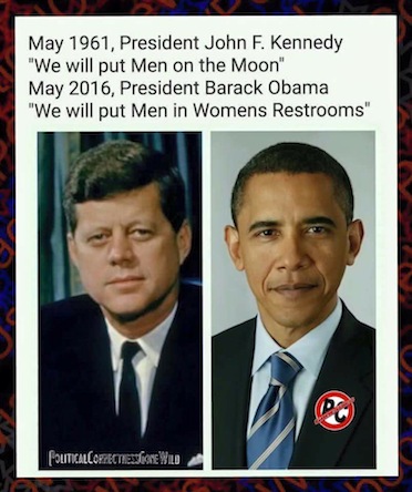 Think about it—the government has invited themselves into public bathroom facilities, nationwide now so What's Next Amerika? When for instance are people going to stop speaking to these people politely at public gatherings—they aren't respectable. They belong in Jail, waiting to be sentenced for their crimes—most of them are not people who should be running for the highest offices in the land. Think about it! |