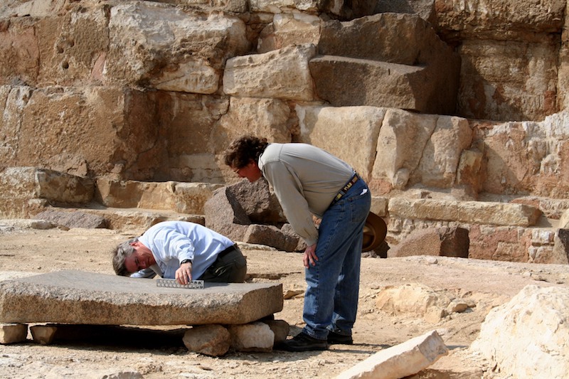Chris Dunn checks the surface of the stone while David Childress looks on