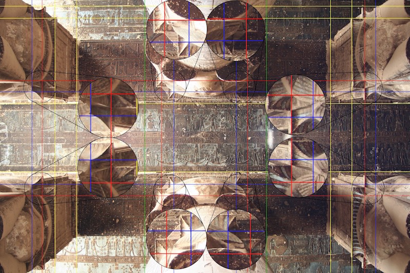 Photograph of four columns with construction lines and ellipses drawn on the bottom of Hathor's tresses