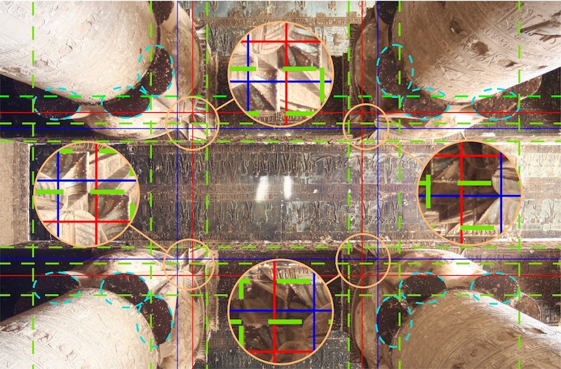Construction lines showing the alignment of the capitals to each other. Pay attention to the red and blue lines which cross the A-B point