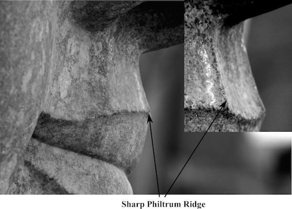 An error in the cutting where the tool dug into the corner of the mouth. Note that the lips were cut deeper to compensate