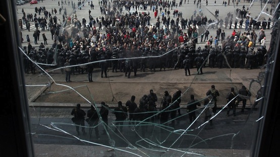 “A photo taken through a shattered window shows pro-Russian protesters gathered in front of Ukrainian police officers, who are standing guard of the Kharkiv regional state administration building on April 8, 2014. Ukrainian policemen were injured as a result of an operation to free the administration building from pro-Russian separatists.