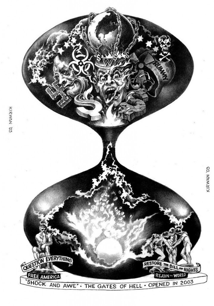 While wrestling with what’s happened to so many of the professions that I was once part of: It’s become clear that the basic circumstances by which most ordinary people continue to try to live in the world today have been radically altered—in every way. First a run-down of exactly how these changes have affected the everyday parts of what once was the society that everyone participated in. If you’re under fifty years of age, this probably won’t make much sense to you but then most of you have become road-kill already so that’s no longer relevant to the wider world either. When I began to shape the life I wanted to live there were literally thousands of occupations from which to choose—today those choices have been reduced to less than a handful of ‘occupations’ that you can choose to become part of. To understand this massive social change, I’ll use my own experiences to illustrate what I’m talking about. W From that I came back to the states and taught myself architecture. I designed both track and luxury homes, and then moved on to hospitals, clinics, businesses, bars, restaurants and office complexes. I spent seven years in that area. I left that field for political illuminations and politics from the outside, followed by literally thousands of facial studies, portraits in pastel (above) and graphite, which led to sculpture, etchings, and eventually into oils and commercial-design accompanied by illustration, book and record covers, for major producers, as well as graphics for small television stations in Southern California. From that I went into international prints of my work that were sold both nationally and internationally as posters, prints, notecards and puzzles. By 1973 I had begun a career in murals and fine-art that was what I thought I might end up doing for the rest of my life. It was about that time that everything began to change, not just for me but for the entire nation. Money for ‘art’ had begun to dry up, in tandem with the first meeting of the Trilateral Group or as some called it, the 300 club. “Art” and artists were something that had been around for over 17,000 years at that time before IRS eliminated that category and replaced it with commercial-artists-only. Something I’ve actively fought against since 1973. Apparently those of us in that ‘profession’ lost that battle. When the change occurred people still read books, or paperbacks at least—so book-cover-art was still a viable alternative. http://www.kirwanesque.net/kirwan-art/black-lizard/ Art was also used for record covers (the 78 version) was large enough to still need images to sell records. Meanwhile everything was changing at a lightning pace. There were dozens of major weekly-magazines, newspapers and periodicals all of which occasionally bought images or articles. The graphic arts were active and productive throughout the sixties. They each continued on for a bit longer but then began to die out. Newspapers took over as the more expensive hardcover- magazines like “Horizon” began to die. The same thing was happening to movie-art, posters and graphic-memorabilia in virtually every field as the arts died and technology moved in to replace the hand-crafted world of individuals in field after field. When I was young it seemed like magazines and newspapers, records and basic designs would always be part of the landscape. But as everyone can now see, none of that was true. Everything has gone the way of rotary-dial telephones, “public-radio” and silent movies. Everything is determined now by corporations and is no longer dictated by what people might want to buy—instead ‘we’ are governed by corporate-tastes that are determined in board-rooms by the very elite who are surrounded by mercenary thugs that keep them at a safe distance from those of us who disagree with what they continue to dictate as to how our lives shall be lived. And as we’ve all been able to see now, nothing which disagrees with their decisions can be tolerated any longer. (1) Consequently only political-art still survives, (as illustrated in the hourglass above) and that too is definitely on the edge of oblivion as well. What I never expected to die was public conversations, basic privacy, the actual constitution, or even international law, all of which has now been outlawed… April