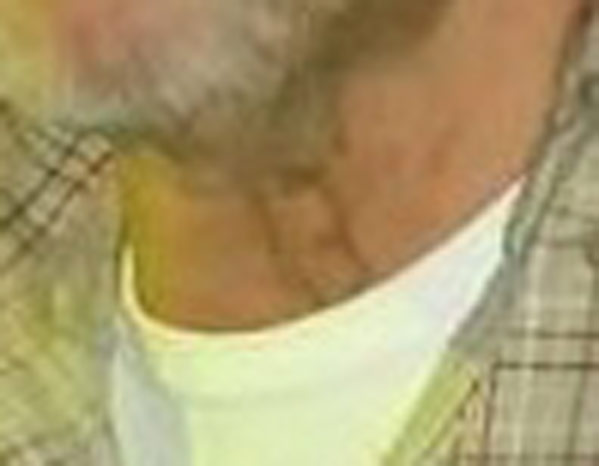 Look again…there is NO DARK BLUE - or ANY TATTOO INK, just loose, folded skin hanging over and down below his 'Adam's Apple'