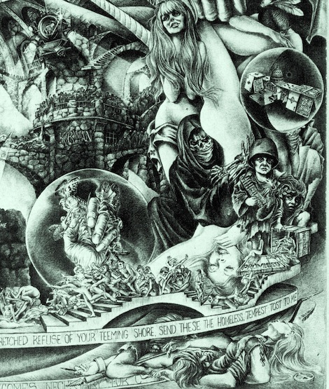 History has also shown us the role of all the formal religions, rising from the ragged pages of this truncated history that’s all we had to go on around the time that credit cards were invented for the populace you can see the woman being crucified on one, just above my right shoulder. This was back in 1973. Scroll down to Preliminary Sketch: at the bottom of the link http://www.kirwanesque.net/kirwan-art/projects/special-projects-2/ Remember that we’ve only been living in this technological age since roughly the turn of the 19th to the 20th century. Telegraphs, telephones and radio are technically relatively new devices, as history’s go. Electricity is not all that old and as far as gasoline and combustion engines go; hell we’re barely out of the days of the horse and buggy. In almost all of this we have routinely chosen to sink every dime we could get our hands on into the production of weapons and virtually unending ways to wipe out humanity. Out leaders act as if slaughtering humanity is the only reason for ‘technology’ to even exist. The proof lies in the fact that we have not chosen free energy, pure water, plentiful food or even clean air: In fact just the reverse is in vogue right now, along with chain gangs of old, that are about to also make a come back as part of permanent detention camps, everywhere shown above in the upturned palm of the blind woman being studied by Angela Davis… All of this was not just visible but blatantly so In the early 1970’s