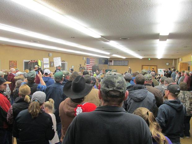 “When police stopped a group of vehicles containing Harney County occupation leader Ammon Bundy on Tuesday, the activist was two hours from John Day where he was scheduled to speak. People turned up by the hundreds in the Grant County town of John Day to listen to Bundy and others talk about the protest at the Malheur National Wildlife Refuge in adjoining Harney County. Some toted signs against the occupation. Far more turned up to express their solidarity with the Harney County protest. Before the meeting's scheduled opening at 6 p.m., the standing-room-only crowd at the John Day Senior Center started buzzing with rumors. Something had gone wrong on Bundy's way to the meeting. A crowd divided Many people in Grant County are angry about what they feel is the government's mismanagement of the Malheur National Forest. They're angry about the raging forest fire this summer that destroyed more than 25 homes. They say if they were given more freedom to log and graze, the forest would be better managed. That's the view of Jim Sproul, a 63-year-old John Day native who was one of the early arrivals at the senior center on Tuesday. At 4:30 p.m., he was inside setting up chairs. Sproul's family settled in John Day at the turn of the century, becoming ranchers. Growing up, Sproul remembers a vibrant community, with several sawmills. But the federal government stepped in, he said, curtailing logging and grazing rights... "These folks are not terrorists," Sproul said. "This is way bigger than the Bundys. It's bigger than the citizens of Grant and Harney counties. This is a national problem." k- This was mentioned by Dwight Hammond when he told the crowd after he had been ordered to return to prison for the second time : “The Bundy's and the Militia men don't speak for them.“This isn't about me.” Dwight said: But it is about freedom for every one of us, and until we chain those rabid-dogs in the uniforms of government slave-masters, we will never be able to free ourselves from everyone that continues to try and control all our freedoms, on any side of this breathing nightmare. “By 5 p.m., about 100 people had turned up. An hour later, it was standing room only with about 300 inside and dozens more milling about outside carrying protest signs. Inside, some wore cowboy hats; others had baseball caps. If any carried guns, they weren't on display, said Jim Hammett, a 61-year-old retired U.S. Forest Service official who's lived in John Day for 20 years. Hammett, who's rarely protested, carried a stick sign outside the meeting that said: "Might is not right." He doesn't want John Day to become divided like Burns, he said, with neighbor against neighbor. "People in small communities get along in their day-to-day dealings with each other by knowing what opinions they can express," Hammett said...” http://www.oregonlive.com/oregon-standoff/2016/01/post_3.html https://www.youtube.com/watch?v=ZsVOwz-FCq4