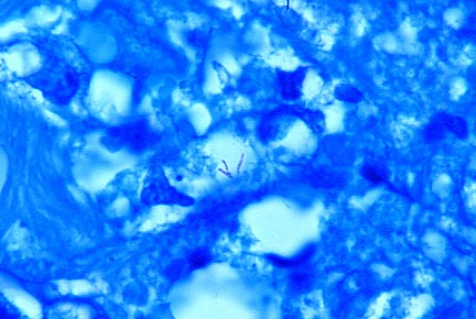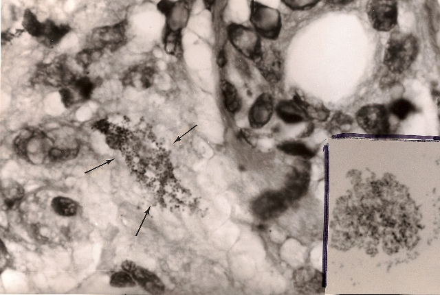 Figure 2. Hodgkin’s lymphoma of the skin. Arrows point to a large collection of minute granules and coccoid forms in the deep dermis. Fite (acid-fast) stain, x1000, in oil. Insert shows appearance of Propionibacterium (Corynebacterium) acnes bacterial cultured from the skin lesion. Ziehl-Neelsen (acid-fast) stain, x1000, in oil Compare the similar size and shape of the bacteria seen in the skin (in vivo) with those cultured in the laboratory.