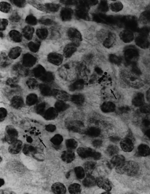 Figure 1. Hodgkin’s (B cell) lymphoma of the lung. Arrows point to a rare collection of intracellular variably staining coccoid forms. MacCallum-Goodpasture Gram stain, magnification x1000, in oil.