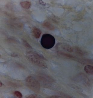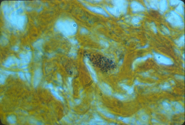 Figure 9. Mycosis fungoides (T cell lymphoma) of the lymph node showing an intracellular clump of tightly-packed coccoid forms. Alexander-Jackson’s triple stain, x 1000, in oil. Compare the size and shape of the node forms to those seen in the skin in Figure 7 from the same patient. |