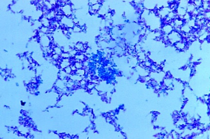 Figure 3. Hodgkin’s lymphoma of the lymph node. Variably sized coccoid forms and larger bodies consistent with cell wall deficient “large bodies” and also to “Russell bodies.” Gram stain, x1000, in oil.