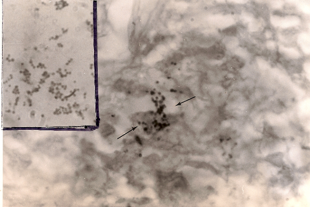 Figure 7. Mycosis fungoides (cutaneous T-cell lymphoma) of the skin. Arrows point to extracellular scattered coccoid forms in the deep dermis. Fite-Faraco (acid-fast) stain, x1000, in oil. Insert shows Staphylococcus epidermidis cultured from the lesion. Note the similar size and shape of the cocci cultured to the coccoid forms seen in vivo in the skin lymphoma. Ziehl-Neelsen (acid-fast) stain, x1000, in oil.