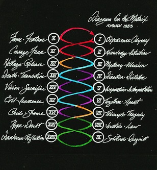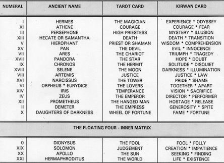 The MATRIX, Triple Zero in the deck, is incomplete but you can see how some of these topics might be part of the keys, to parts of any life that might need more attention? The chart below was created in 1991 and tracks the connections between the deep past and the contemporary aspects of the same characters. These topics in the deck are not new, most of them are about what we already ‘know’ but too often we’re just not as conscious of them as we might be.