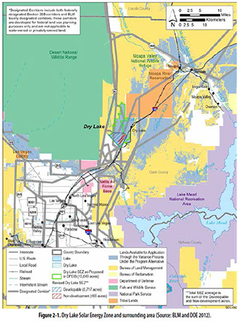 Six Southwestern States” on land “managed” by BLM. Dry Lake Solar Energy Zone and surrounding area (Click to enlarge.) “The Approved Resource Management Plan Amendments/Record of Decision (ROD) for Solar Energy Development in Six Southwestern States implemented a comprehensive solar energy program for public lands in those states and incorporated land use allocations and programmatic and SEZ-specific design features into land use plans in the six-state study area.”