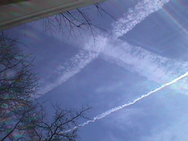to horizon about 1:00 p.m. with crosses upon crosses of chemtrails. Way