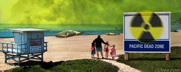 Radiation from the destroyed, triple meltdown Fukushima nuclear calamity is killing off masses of animal and vegetable sea life all over the North Pacific. From hundreds of species of kelp and vegetable life to thousands of species of animals…our ocean will never be the same again. You must wake up…your days of eating anything from the Pacific are over. This deadly, cumulative radiation does NOT stop at the beach and continues moving inland on the wind and the rain as it settles into the entire environment of the West Coast on its journey eastward. It then migrates over the Sierras and Cascades and heads into the heartland of America. From there it spreads its endless radioactive legacy over the Eastern states …and then on out over and into the Atlantic, changing the world forever. |