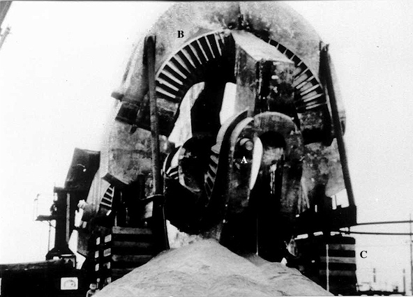 | Did some unknown prehistoric civilization utilize such massive unidentified machinery as this huge "what's it?" said by an informant of Brad and Sherry Hansen Steiger to have been excavated from a great depth circa 1990-91 on government property during work on a secret project? According to the Steigers' anonymous informant, this incredible, gargantuan artifact--see how it dwarfs the dumpster on its left side--and five or six exactly like it were unearthed, then all reburied in the same area. The surface of the mysterious apparatus is covered with peculiar hieroglyphs. This photo is taken from UFOs Are Here! by Brad Steiger and Sherry Hansen Steiger. |