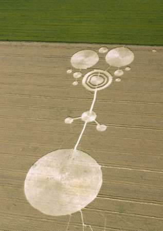 | An aerial view of crop circles, which were found last Saturday by a wheat farmer, near Fairfield in California, photographed on July 2, 2003. The geometric pattern of pressed wheat stalks which mysteriously appeared this week have been drawing hundreds of interested sightseers. ![]()