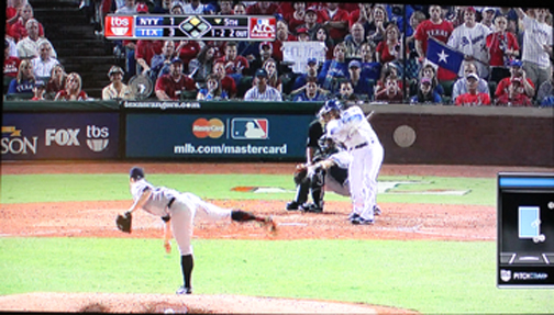framed over the batter's shoulder. Light on one side, a ghost on the other.