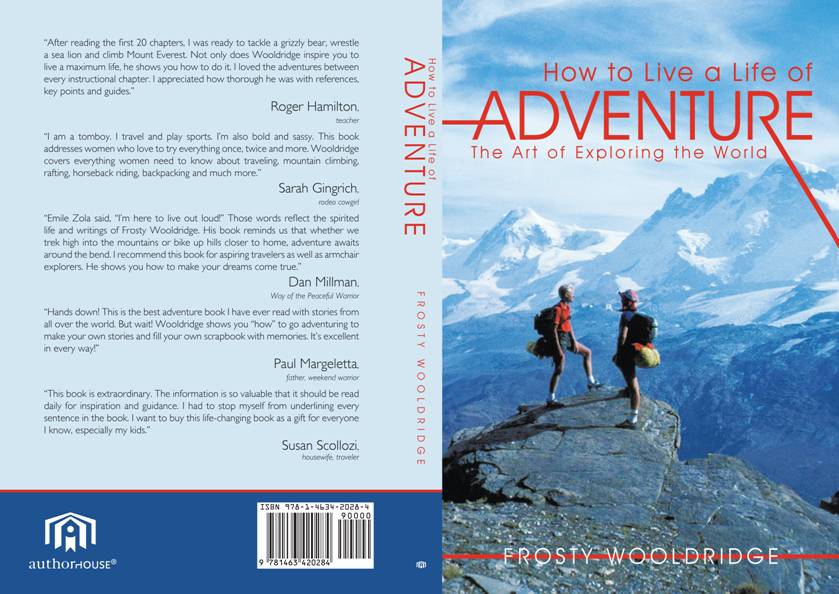| "Frosty Wooldridge is one remarkably passionate individual. I'm glad he's a friend that allows me to participate in some of his tamer adventures. InHow to Live a Life of Adventure, he raises the lid on a treasure trove of fascinating and challenging experiences. You will be inspired by the retelling of his adventures and guided by his bountiful advice. He shares what he's learned after undertaking a cornucopia of challenges around the world. If you choose to follow the advice contained in his book, you'll never look back and be disappointed by the things you never tried. You will have transformed the course of your own life." --Bob Johannes, Chrysler Corporation executive
