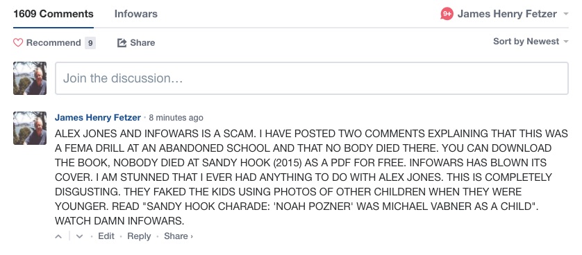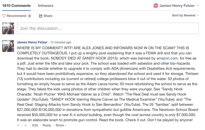 Fetzer Regarding Alex Jones 'Condolences' For Families Who Lost Children At Sandy Hook! Prof Fetzer's Comment was deleted by Infowars