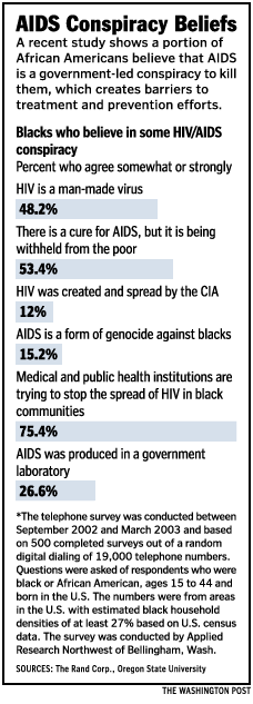 That belief markedly hurts efforts to prevent the spread of the disease among black Americans, the study's authors and activists said. African Americans represent 13 percent of the U.S. population, according to Census Bureau figures, yet they account for 50 percent of new HIV infections in the nation, according to the Centers for Disease Control and Prevention. Nearly half of the 500 African Americans surveyed said that HIV, the virus that causes AIDS, is man-made. The study, which was supported by the National Institute of Child Health and Human Development, appears in the Feb. 1 edition of the Journal of Acquired Immune Deficiency Syndromes. More than one-quarter said they believed that AIDS was produced in a government laboratory, and 12 percent believed it was created and spread by the CIA. A slight majority said they believe that a cure for AIDS is being withheld from the poor. Forty-four percent said people who take the new medicines for HIV are government guinea pigs, and 15 percent said AIDS is a form of genocide against black people. At the same time, 75 percent said they believe medical and public health agencies are working to stop the spread of AIDS in black communities. But the responses, which varied only slightly by age, gender, education and income level, alarmed the researchers. "As a researcher knowing that these beliefs were out there, I wasn't as surprised as people I share the study with," said Laura Bogart, a behavioral scientist for the Rand Corp., who co-authored the study with Sheryl Thorburn, associate professor in the College of Health and Human Sciences at Oregon State. "But the findings are striking, and a wake-up call to the prevention community," Bogart said. "The prevention community has not addressed conspiracy beliefs in the context of prevention. I think that a lot of people involved in prevention may not be from the community where they are trying to prevent HIV." The findings were also no surprise to Na'im Akbar, a professor of psychology at Florida State University who specializes in African American behavior. "This is not a bunch of crazy people running around saying they're out to get us," Akbar said. The belief "comes from the reality of 300 years of slavery and 100 years of post-slavery exploitation." Akbar cited the Tuskegee experiment conducted by the federal government between 1932 and 1972. In it, scientists told black men they were being treated for syphilis but actually withheld treatment so they could study the course of the disease. Today, he said, African Americans are more likely to live in communities near pollution sources, such as freeways and oil refineries, and far from health care centers. "There are a lot of indicators that our lives are not valued," Akbar said. Phill Wilson, executive director of the Black AIDS Institute in Los Angeles, said past discrimination is no longer an excuse for embracing conspiracies that allow HIV to fester. "It's a huge barrier to HIV prevention in black communities," Wilson said. "There's an issue around conspiracy theory and urban myths. Thus we have an epidemic raging out of control, and African Americans are being disproportionately impacted in every single sense." Black women made up 73 percent of new HIV cases among women in 2003, and black men represented 40 percent of new cases, according to the most recent federal figures available. Among gay men, blacks represented 30 percent of new infections, and adolescents ages 18 to 24 accounted for nearly 80 percent of new HIV cases. "The whole notion of conspiracy theories and misinformation . . . removes personal responsibility," Wilson said. "If there is this boogeyman, people say, 'Why should I use condoms? Why should I use clean needles?' And if I'm an organization, 'Why should I bother with educating my folks?' The syphilis study was real, but it happened 40 years ago, and holding on to it is killing us." Alan